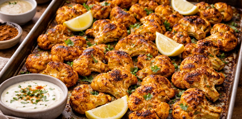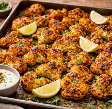 Golden, aromatic, and incredibly satisfying. This tandoori cauliflower is marinated in fragrant spices, roasted until perfectly caramelized, and served with a creamy yogurt–tahini sauce.